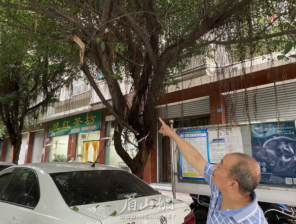 眉山網訊(記者 張丹梅 文/圖)日前,市民徐先生向眉山日報報料熱線028—38166844報料稱,他所居住的城區東柒街行道樹10年未修剪,枝葉茂盛遮擋光線,影響居民安全出行,希望相關部門能盡快修剪。